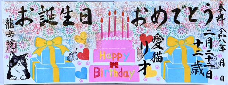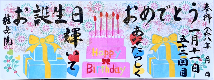龍岳院では、色々な御朱印をお書きしてきました。今では、多くの寺社が色々な御朱印をお書きしていますが、お誕生日御朱印、お名前入り御朱印、コラボ御朱印、シークレット御朱印というものは、龍岳院が始まりです。いずれも、参拝者が楽しくお寺にお参りできるようにと、取り組みした御朱印です。お誕生日御朱印は1年に1度、お誕生日月にお参りいただいた時にお書きしております。お誕生日は、1年に1度の大切な日、さまざまなご縁に感謝する日でもあります。龍岳院では、お祝いする気持ちをこめお誕生日御朱印をお書き致します。