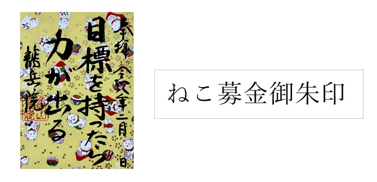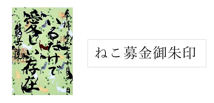 毎月の御朱印+猫募金御朱印となります。いずれも当月の御朱印対応日のみお渡し可能です。「毎月の御朱印」は書置きとなり、ご自身で御朱印帳にお貼りいただきます。この他、御朱印帳にお書きする御朱印はホームページなどでお知らせいたしません。当日、おまいりいただいた時にご確認ください。